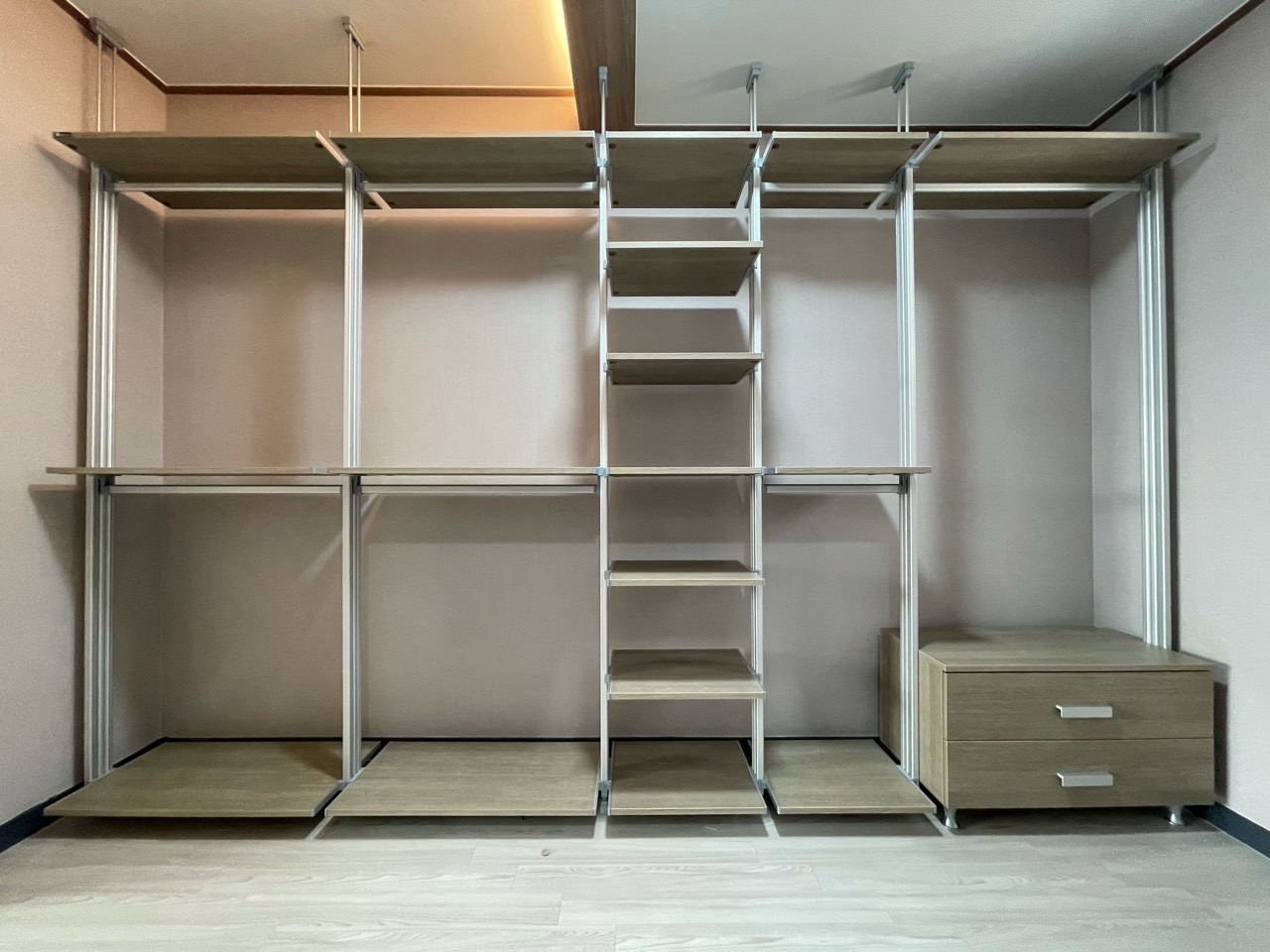 구성품으로는 2단행거, 7단선반, 2단서랍장으로 배치되었습니다.