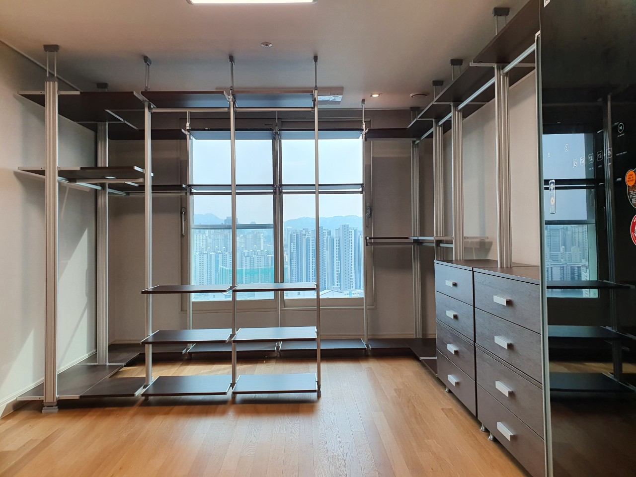 이번 시공사례는조금 특이한 ㅁ자 구조입니다.구성품으로는 4단서랍,거울장, 긴옷장을 배치해서 월넛색상으로 시공했습니다.