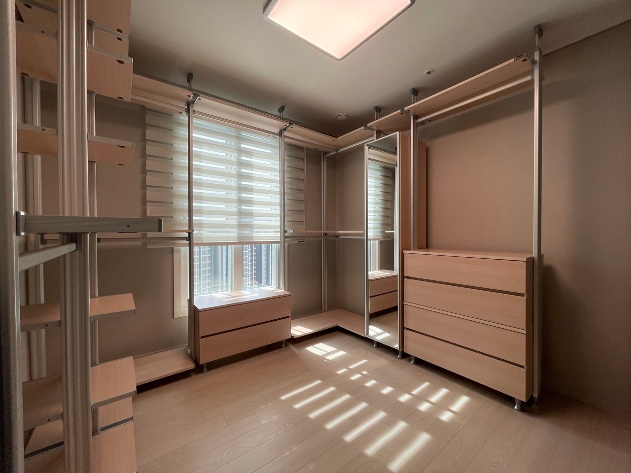 이번 시공사례는 ㄷ자 구조입니다.방 구성품으로는 2단서랍장, 4단 서랍장, 7단선반, 거울장을을 배치하여 워시로 시공했습니다.