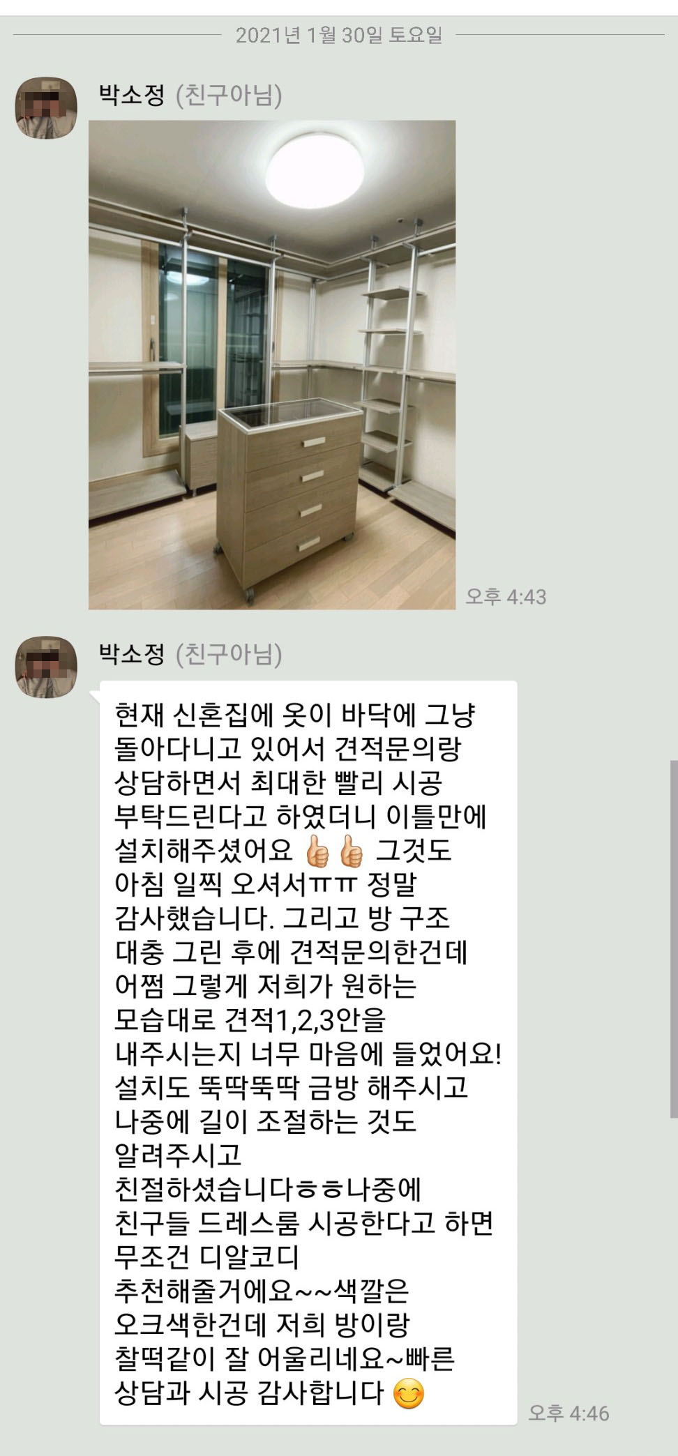 경기 양주시 양주서희스타힐스 2단지 박소정 고객님의 카카오톡 채널 후기입니다.