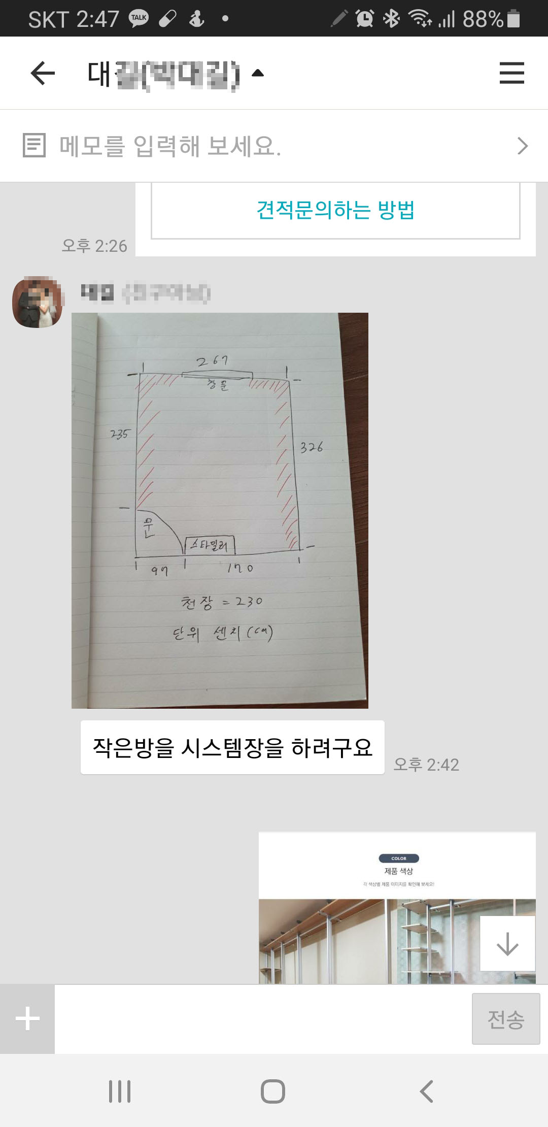 9월 17일 여수에서 시공한 고객님께서 카카오톡 채널을 통해 보내주신 방사이즈 그림입니다. 창문 쪽을 비우고 11자 설치를 원하셨습니다.