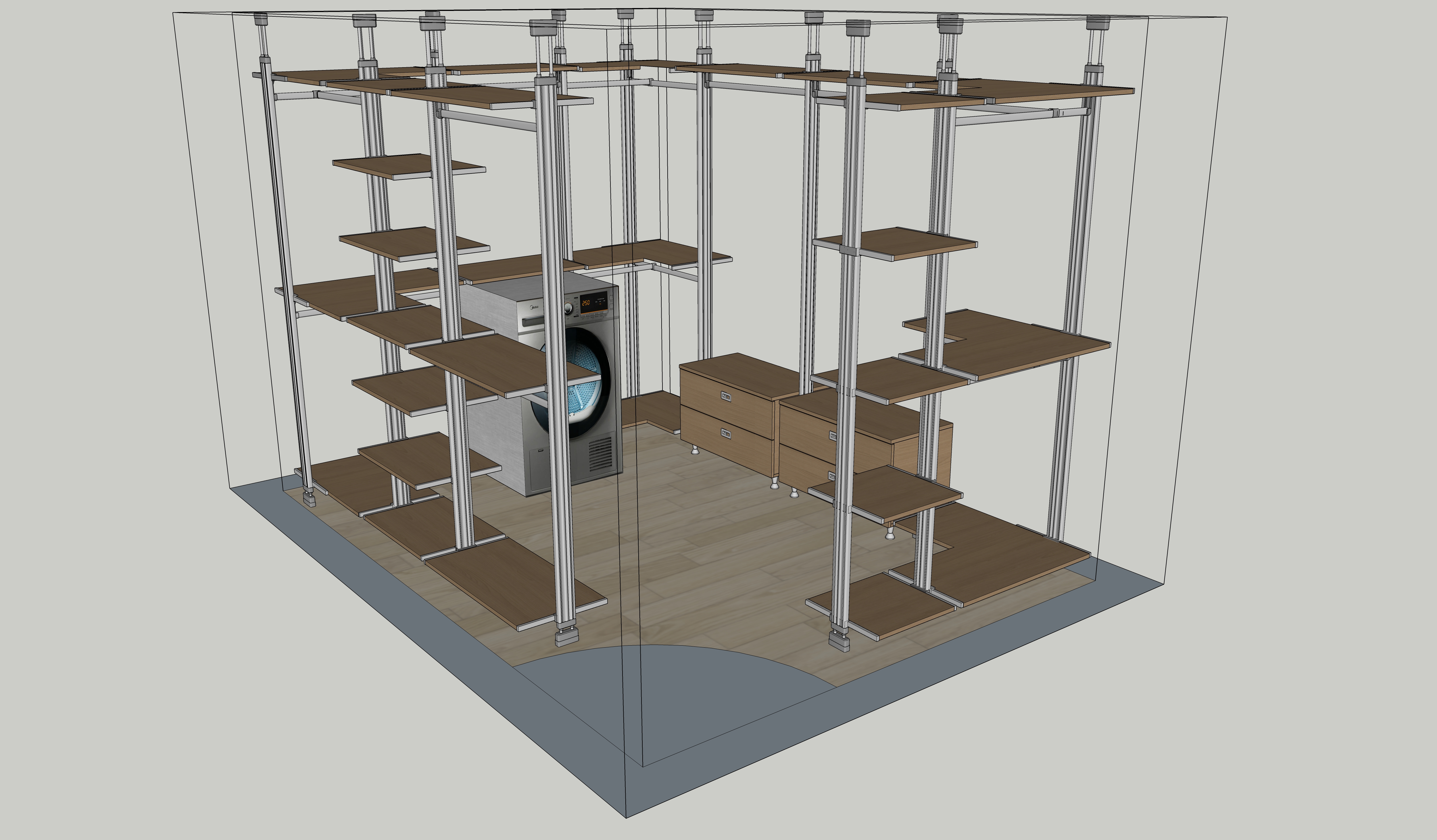 방 구성품으로는 2단행거, 2단서랍장2개, 5단선반, 7단선반을 배치하였고, 가지고계시던 건조기를 생각해