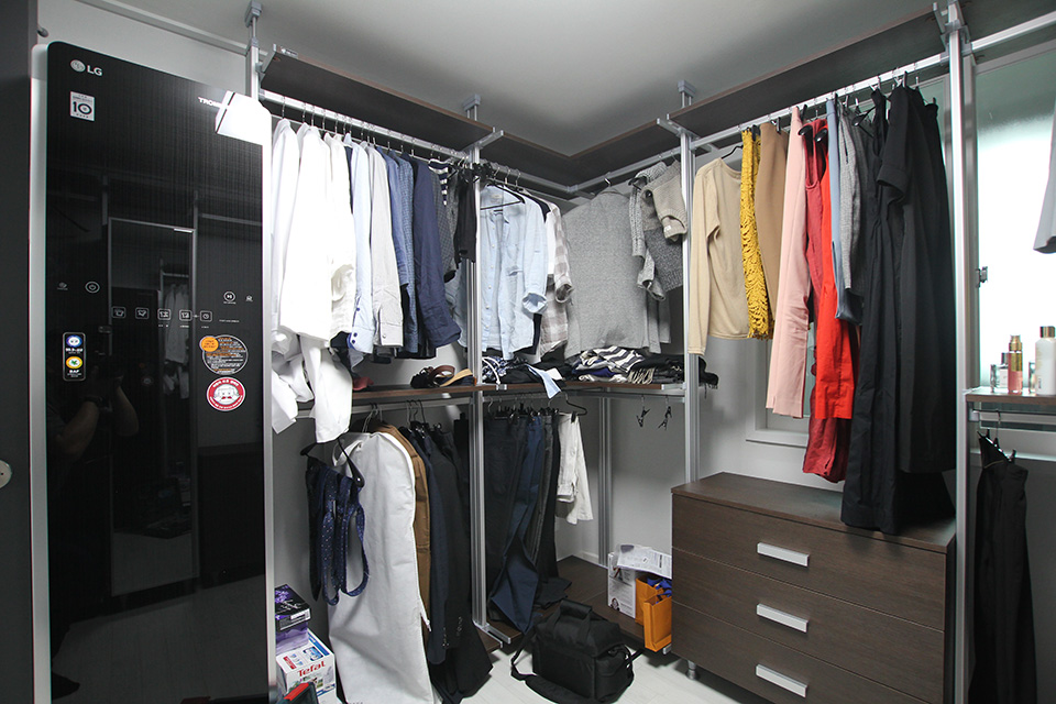 드레스룸을 세운 다음 벽에 구멍을 뚫어 ㄱ자 꺾쇠로 고정하는 벽 고정 방식과 디알코디 드레스룸처럼 바닥과 천정에 고정하는 방식이 있습니다.