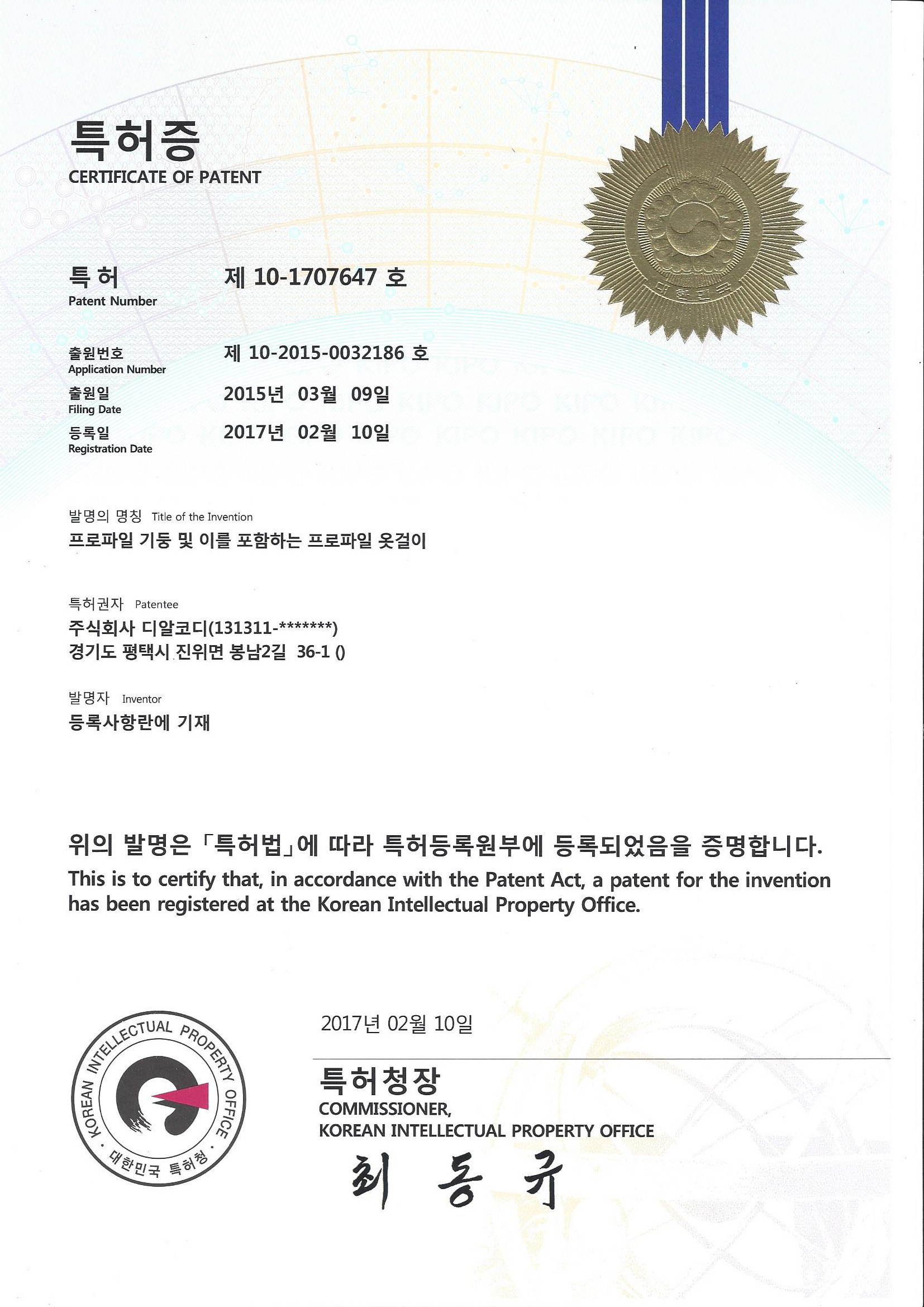 디알코디 메티스 드레스룸 기둥의 두 줄 심지에 작용하는 스톱퍼는 디알코디가 취득한 특허입니다.