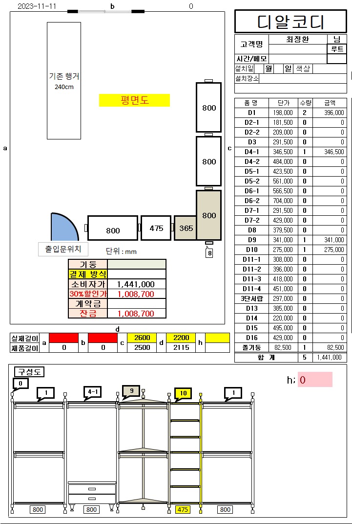 설치 주소의 정확한 방 문 사이즈와 층고는 7월2일 이후에 실측할 수 있습니다. 서랍 추가 없이 옷걸이로만 구성하고 싶습니다. 이전 설치비와 추가되는 부분 설치비를 대략 알고 싶은데 어느 부분 실측이 필요한 지 알려주세요.
